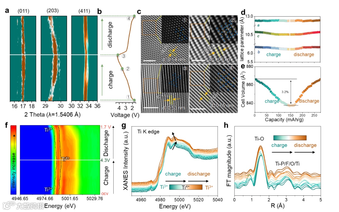 图4 NTPF电极的钠储存机理研究;NTPF电极的2D XRD轮廓图(a)与相应的充电/放电曲线(b);(c) 不同充电/放电状态下NTPF电极的HRTEM图像,插图显示了带有原子排列模型的放大HRTEM图像;充放电过程中NTPF电极的a、b、c(d)晶体参数的变化和电池体积变化(e);NTPF电极Ti K边缘的操作XANES轮廓图(f)和相应的XANES光谱(g);(h) NTPF电极Ti-K边EXAFS光谱的傅里叶变换幅度