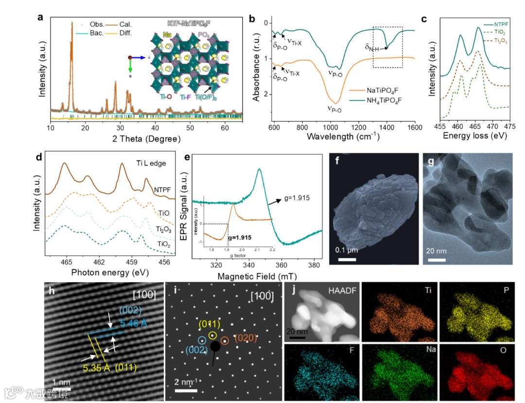 图2制备样品的特征。(a) NTPF样品XRD 精修图谱,插图中给出了相应的KTP型晶体结构模型;(b) NTPF和NH4TiPO4F样品的FTIR光谱;(c) NTPF和参考Ti2O3、TiO2的在Ti-L2,3边的EELS光谱;(d)NTPF和TiO、Ti2O3、TiO2在Ti-L边sXAS光谱;(e)NTPF粉末的EPR光谱,g因子分布如插图所示;NTPF颗粒的SEM(f)、TEM(g)、HRTEM(h)图像和SAED图案(i);(j) NTPF选定元素的STEM-EDS mapping结果.