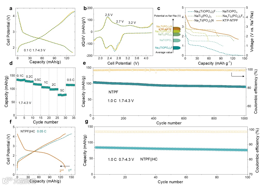 图3 NTPF电极的电化学性能研究。在0.1C、1.7-4.3V之间的NTPF半电池中获得的典型充放电曲线(a)和相应的dQ/dV曲线(b);(c)NIB几种代表性Ti基电极材料的放电曲线的比较,左侧显示了插图中的平均工作电位;(d) NTPF电极在0.1至5C的倍率性能;(e)在1C下进行1000次循环的循环过程中的可逆容量和相应的库仑效率;(f) NTPF||HC全电池的初始两个充电/放电曲线(f)和循环性能(g)