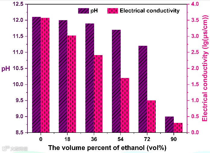 图4 不同乙醇体积百分比乙醇/胺缓冲溶液的pH和电导率
