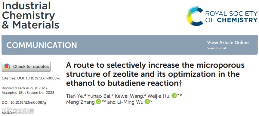 近日,中山大学张蒙副教授团队在期刊Industrial Chemistry & Materials上发表题为“A route to selectively increase the microporous structure of zeolite and its optimization in the ethanol to butadiene reaction”的文章。本文通过向有机胺水溶液中添加一定量的乙醇生成醇胺缓冲溶液,开发了一种温和刻蚀沸石分子筛的方法,对分子筛的微孔结构进行选择性调控。此外,团队分析了缓冲溶液的形成过程,提出了醇胺缓冲溶液对沸石分子筛孔道的调控机理,考察了该方法对催化剂的晶体结构和孔结构的影响。微孔增加的催化剂在乙醇制丁二烯反应中表现出优异的催化性能:乙醇的转化率99.56%和丁二烯的选择性69.43%。
