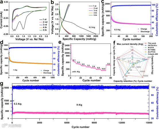 电化学性能测试表明,Co-HITP负极极具有优异的电化学活性和稳定性。如图4d所示,在1.0 A g−1下,经过500次循环后,可获得高达352 mA h g−1的高容量。此外,Co-HITP电极在8.0 A g−1的高电流密度下,经过15,000次循环后容量保持率高达82.0%,表明其较高的循环稳定性。与其他报道的用于SIBs的MOF负极(图3f)相比,Co-HITP负极表现出显着的循环稳定性、倍率性能和容量。