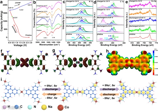 为了进一步研究Co-HITP负极的钠储存机理,进行了XPS和FT-IR光谱测试 。图4b显示了在放电过程中,C=N在1630 cm−1处的峰值随C-N在1425 cm−1处的增加而减小。充电后发现相反的趋势,表明配体具有接受Na+离子的活性位点。Co 2p XPS光谱如图4e所示,781.4 eV(Co 2p3/2)和797.2 eV(Co 2p1/2)的峰在放电和充电过程中均无变化,表明金属中心钴不发生转化反应,也不参与钠储存过程。此外,根据理论计算,提出了放电和充电机理,如图4i所示。在放电/充电过程中,最小结构单元中C=N活性位点可存储6Na+,芳香环可嵌入8Na+。