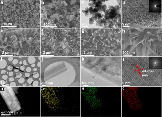 图2.(a-d)Co-HITP-P形貌图,(e-h)第1、2、3和第9999次循环后Co-HITP负极的FESEM图像,(i-k)第9999次循环后的Co-HITP形貌图。