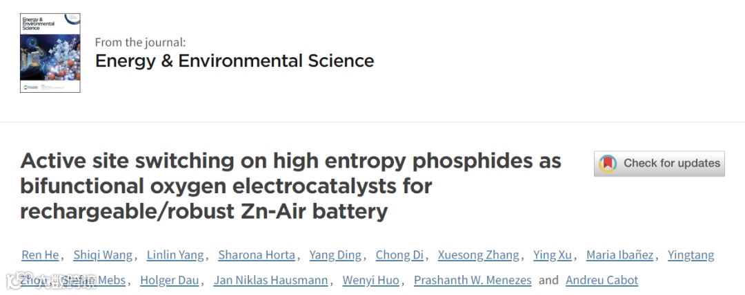 近日,由加泰罗尼亚能源研究所Andreu Cabot课题组何仁博士主导的国际研究团队,成功设计并开发了一种基于FeCoNiPdWP的高熵磷化物(HEPs),作为新型双功能氧电催化剂,应用于可充电锌空气电池。该研究成果发表在国际顶级期刊《Energy & Environmental Science》。