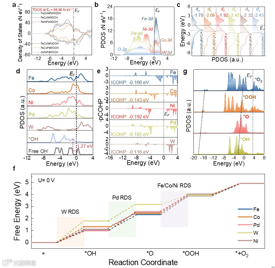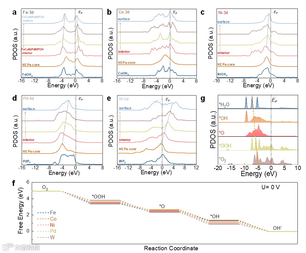 3 活性位点转换机制的揭示:通过详细的实验对比、原位测试及DFT理论计算,研究证明HEPs在OER和ORR过程中发生了独特的活性位点转换。在OER过程中,Fe、Co和Ni的高熵羟基氧化物成为主要活性位点,而在ORR过程中,Pd表现出最高的催化活性。
