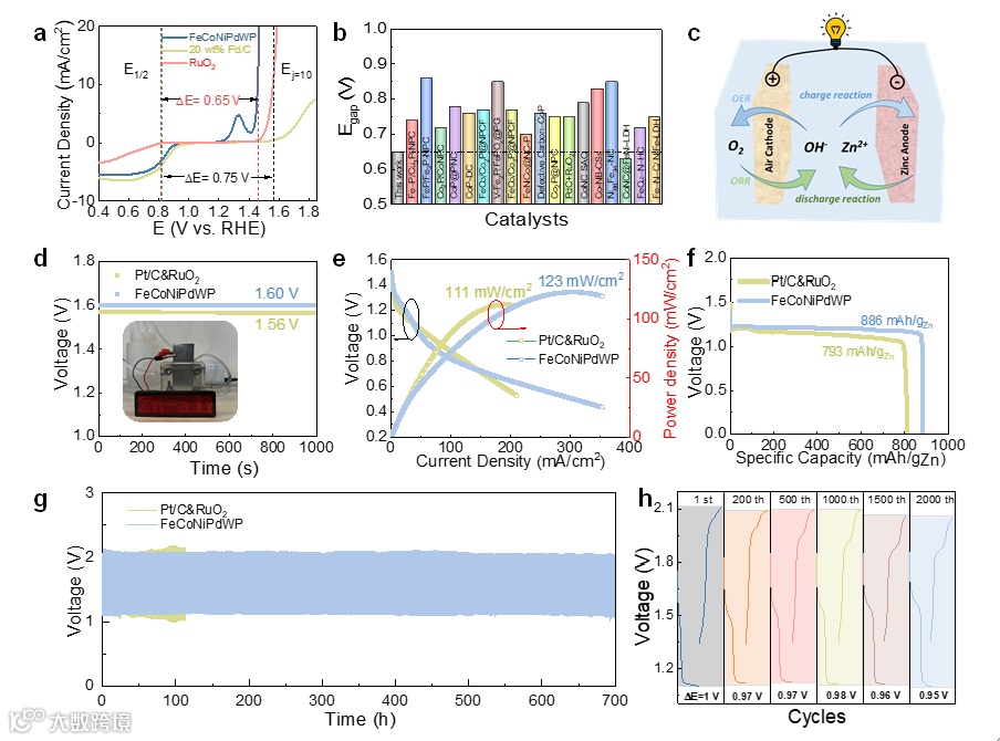 5 锌空气电池的优异性能:将HEPs材料作为锌空气电池的空气阴极,不仅展示出高达96.4%的理论开路电压,还表现出886 mAh/gZn的高比容量,并在连续操作超过700小时后依然保持出色的稳定性。