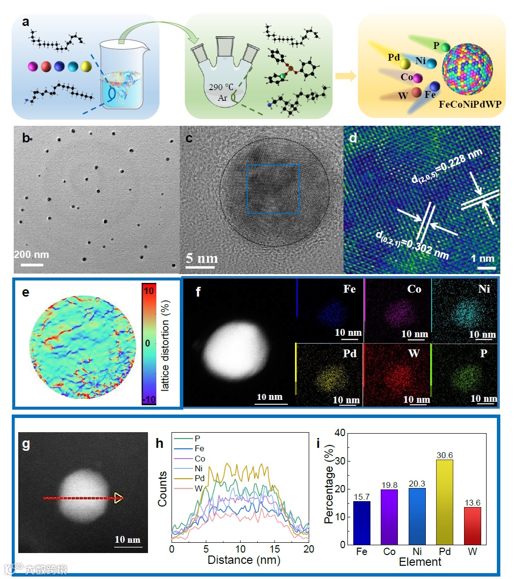 1 高熵化合物的创新设计与合成:研究团队通过精心选择3d/4d/5d元素,采用低温胶体法合成了FeCoNiPdWP纳米颗粒,展现了在电催化领域的应用潜力。