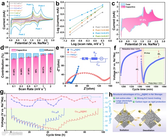 图4.(a)Cu1.96S@NC电极在不同扫描速率下的CV曲线,(b)不同扫描速率下的Log(i)和Log(v),(c)Cu1.96S@NC在2.0 mV s−1下的赝电容贡献,(d)Cu1.96S@NC在不同扫描速率下的赝电容贡献直方图,(e)Cu1.96S@NC和Cu1.96S的Nyquist图(插图为相应的等效电路),(f)电极的GITT测试条件,(g)Cu1.96S@NC和Cu1.96S的GITT曲线和相应的lg DNa+值,(h)Cu1.96S@NC用于快速Na+存储的结构优势示意图