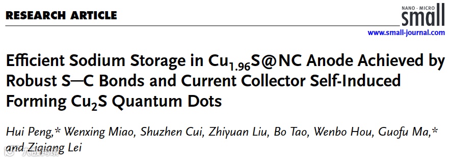 Hui Peng‡*, Wenxing Miao‡, Shuzhen Cui, Zhiyuan Liu, Bo Tao, Wenbo Hou, Guofu Ma*, Ziqiang Lei. Efficient Sodium Storage in Cu1.96S@NC Anode Achieved by Robust S-C Bonds and Current Collector Self-Induced Forming Cu2SQuantum Dots Small, 2024, 2404957.