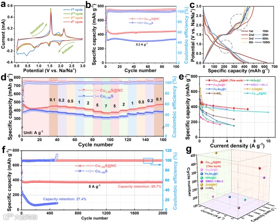 图3.(a)扫速为0.1 mV s−1时Cu1.96S@NC的CV曲线。(b)Cu1.96S和Cu1.96S@NC在0.2 A g−1下的循环性能。(c)0.2 A g−1下Cu1.96S@NC不同循环阶段的充放电曲线。(d)Cu1.96S和Cu1.96S@NC在不同电流密度下的速率能力。(e)本工作与以报道的SIBs材料的倍率性能比较。(f)Cu1.96S@NC和Cu1.96S在5.0 A g−1电流密度下的长期循环性能。(g)本工作与已报道SIBs材料的长循环性能比较。