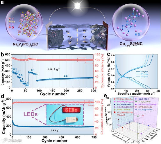 图8. (a)Cu1.96S@NC//NVP@C 全SIB的示意图。(b)SIB的倍率性能。(c)SIB在0.1 A g-1下的前 3个循环充放电曲线。(d)Cu1.96S@NC//NVP@C 全SIB的长期循环性能(插图:由SIB供电的LED)。(e) Cu1.96S@NC//NVP@C SIB与已报道的SIB的循环性能比较。