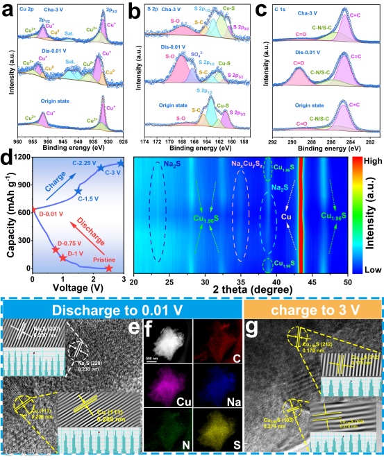 为了更深入地了解Cu1.96S@NC的电化学反应机理,我们利用非原位XPS、XRD和HRTEM系统地研究了Cu1.96S@NC电极在Na+嵌入和脱出过程中的结构转变和相变。图5a-c显示了Cu1.96S@NC电极在不同充放电状态(初始状态、放电至 0.01 V 和充电至3 V)下的Cu 2p、S 2p和C 1s 非原位XPS光谱。放电至0.01 V后,出现了Cu0峰,对应于转换反应中生成的Cu。充电至3 V后,Cu0的比值相应降低,验证了Cu1.96S@NC良好的电化学可逆性。此外,当电极放电至0.01 V时,S 2p3/2和Cu-S的峰值明显下降,而S-O的峰值急剧上升并出现了SO42-,这可能是由于Na2S被氧化并形成了少量的Na2SO4。而充电到3 V后,S 2p3/2和Cu-S的峰明显恢复,S-O峰的强度相应减弱,SO42-峰消失。图5d显示了Cu1.96S@NC在第一个循环中不同终止电化学状态下的充放电曲线和原位 XRD 图。初始电极的衍射峰证实了Cu1.96S物相在电极箔制备过程中趋于稳定。