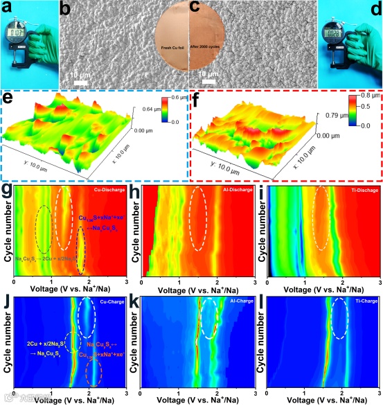 图6. 循环前(a,b)和循环后(c,d)铜箔的厚度测试和扫描电镜图像。循环前(e)和循环后(d)铜箔表面的原子力显微镜图像。Cu1.96S@NC在不同电流收集器上前20个循环的(g-i)放电过程和(j-l)充电过程的dQ/dV等高线。