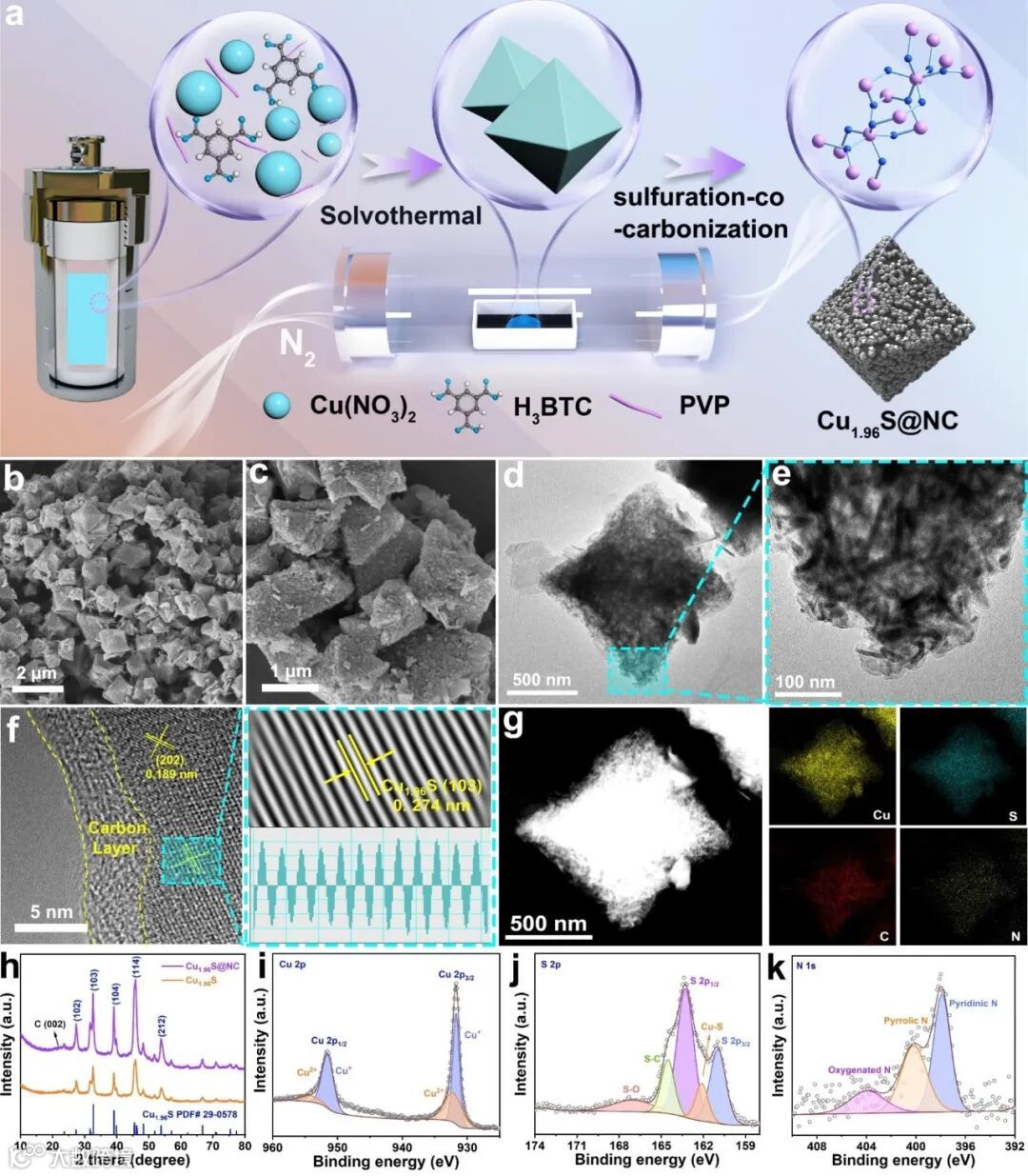 图1. (a)合成Cu1.96S@NC复合材料的示意图。(b,c)SEM图像,(d,e)TEM图像,(f)HRTEM图像,以及(g)相应的HAADF-STEM 图像和EDS元素图谱,(h)Cu1.96S和Cu1.96S@NC的XRD图谱,高分辨率XPS谱图(i)Cu 2p,(j)S 2p,(k)N 1s。