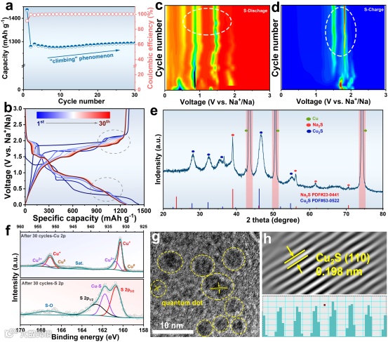 在S@Cu经过30个循环后的高分辨率Cu 2p和S 2p光谱中(图 7f),出现的Cu 2p3/2和Cu 2p1/2的峰值表明Cu2S的生成。令人惊讶的是,S@Cu电极的HRTEM显示了大量晶格间距≈0.198 nm的Cu2S量子点。由于其独特的小尺寸效应,极大地增强了电极与Na+的结合能力,提高了电极的电导率,这为异常容量增长现象提供了完美的理论支持,也解释了循环过程中充放电平台的剧烈变化。