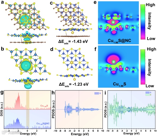 为了探讨在Cu1.96S@NC结构中引入碳基底(NC)和形成S-C键对Cu1.96S储钠的影响,我们利用密度泛函理论(DFT)计算比较了Cu1.96S@NC和Cu1.96S的各种参数。可以看出,与Cu1.96S相比,具有强S-C键的Cu1.96S@NC具有更高的转移电荷密度,这证明了强S-C键能有效提高Na+的吸附能。此外,还计算了Cu1.96S和Cu1.96S@NC对Na+的吸附能(ΔEabs)(图2c,d)。具有S-C键的Cu1.96S@NC的ΔEabs为-1.43 eV,小于Cu1.96S(-1.23 eV),表明与碳基底引入S-C键增强了对Na+的吸附能力。此外,还研究了Cu1.96S和Cu1.96S@NC的总态密度(TDOS)(图2g)。