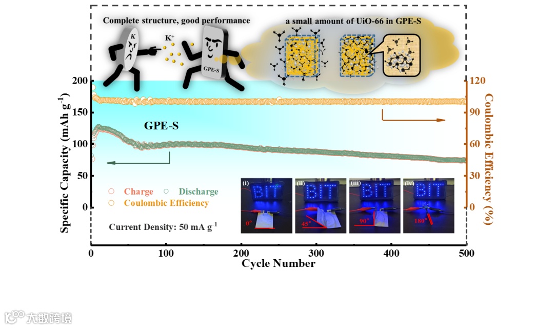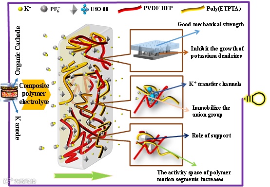钾离子电池具有的成本优势,使其成为目前大规模储能应用的首选。我们为高性能固态钾有机电池设计了复合聚合物电解质。在这种复合结构中,UiO-66通过ETPTA单体的原位UV固化,锚定在三维PVDF-HFP框架中。柔软的PVDF-HFP三维框架都能很好地容纳poly (ETPTA)和UiO-66。通过复合坚固多孔的UiO-66,提高了电解质的机械强度和化学稳定性,并扩大聚合物运动段的活性空间。因此,组装的固态有机钾电池具有优异的容量和超过500次的循环性能。柔软的聚合物与坚硬MOF材料的原位结合的复合电解质设计策略在高性能固态钾离子电池中具有很大的应用潜力。