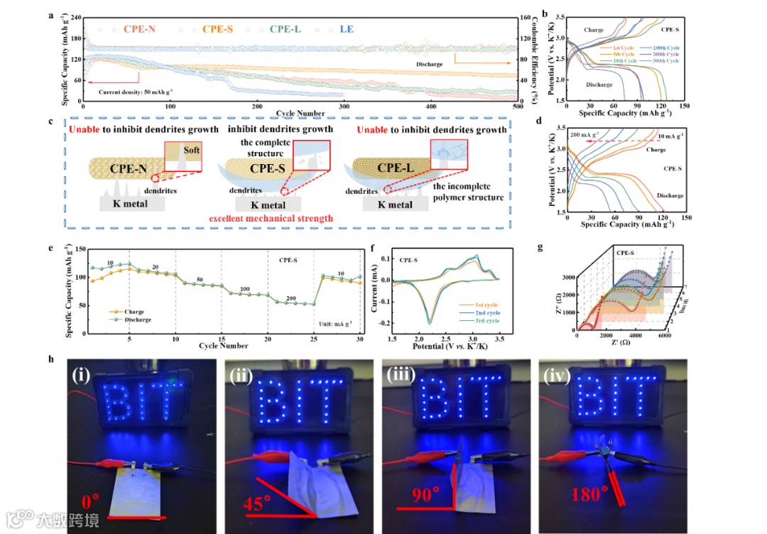 为了进一步评价复合聚合物电解质在SSPOB中的性能,利用复合聚合物电解质组装的固态钾有机电池。复合电解质可以将电解液固定在聚合物内部,大大降低了有机正极材料溶解到电解质中的可能性,同时与金属钾之间保持良好的界面稳定性,减少了电池中副反应的发生,实现了稳定的离子转移。PTCDA|CPE-S|K电池在循环500次后容量保持率仍能达到60.0%,可以看出,表现出令人满意的长循环稳定性,具有一定的商业化潜力。