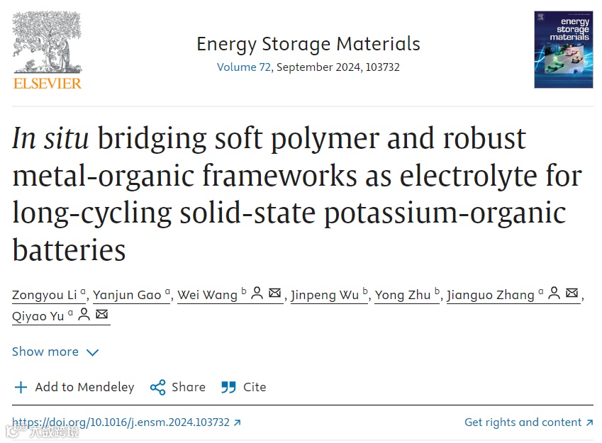 原位桥连柔软聚合物和坚固的金属有机框架作为长循环固态有机钾电池的电解质