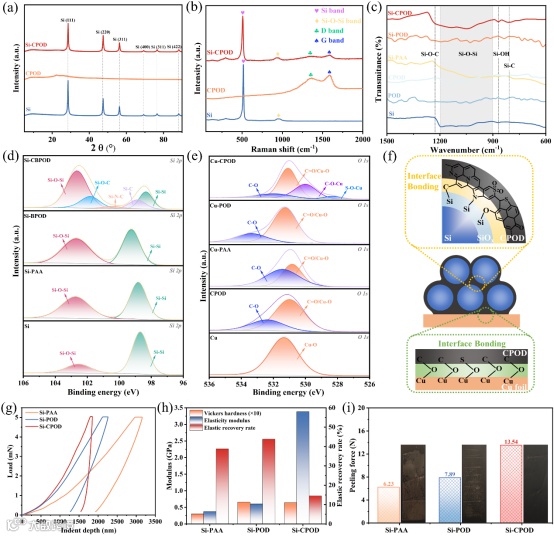 因此,研究确定500℃是优化的碳化温度,它在保证电极高容量的同时,形成了丰富的Si、Cu和粘结剂之间的化学键。最后,研究者通过纳米压痕测试进一步验证了碳化过程对Si电极机械性能的提升。结果显示,Si-CPOD电极的弹性模量明显高于传统的Si-PAA和Si-POD电极,这意味着Si-CPOD电极能够更有效地抵抗由于硅在充放电过程中体积膨胀所产生的应力。此外,醚键的保留在一定程度上确保了碳化后的导电网络仍具备一定的弹性,从而缓冲硅体积的变化。同时,180°剥离测试结果表明,Si-CPOD电极的剥离力显著高于Si-PAA和Si-POD电极,显示出更强的粘附力。在剥离测试后的数字照片中可以看到,Si-PAA电极几乎所有材料都从铜箔上剥离,Si-POD电极则有部分材料剥离,而Si-CPOD电极则表现出极强的粘附力,其表面材料几乎完全保持在铜箔上。由此可见,碳化过程赋予了Si-CPOD电极优异的机械性能,使其在高活性材料含量下仍然能够保持良好的循环稳定性,为未来高性能硅负极的设计提供了重要的参考依据。