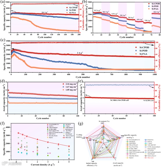 最后,通过组装NMC811正极的全电池测试进一步验证了CBPODB粘结剂的实际可行性。结果表明,NMC811//Si-CBPODB全电池在0.2 C下达到3 mAh cm⁻²的高初始面容量,并在多次循环后保持91.9%的容量,显示出CBPODB框架在提高硅负极实际应用中的巨大潜力。与其他通过碳化工艺改性硅负极的比较显示,Si-CPOD在各个电化学性能参数上均表现优越,包括更高的硅含量、比容量、初始库伦效率(ICE)、面容量和更长的循环寿命,表明其在下一代高性能锂离子电池中的应用前景广阔。