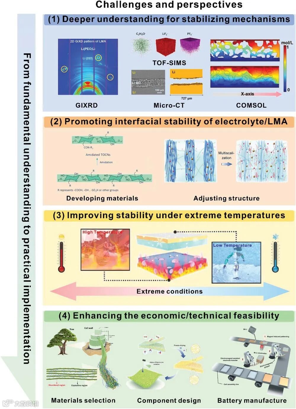 作者认为,尽管在稳定LMBs方面已经取得显著进展,但目前多尺度纤维素材料的技术成熟度仍未达到实际应用或商业化的标准。在从理论到实践的转化过程中,面临着诸多挑战。例如,锂金属负极(LMAs)在实际操作条件下的反应机制和材料行为还未被完全揭示,长期使用中的稳定性问题也尚未得到全面解决,而且在更大规模应用中的技术可行性还有待提高。针对这些挑战,本文提出了以下建议: