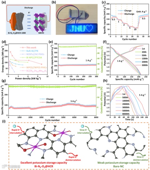 将Bi-N4-O2@HCR-1000负极与MKVO正极匹配并组装了全电池体系,该全电池表现出了较好的储钾能力。倍率性能表现为在0.5、1、2、5、10 A g-1的电流密度下的放电比容量分别为171.0、161.4、123.6、95.8和75.0 mA h g-1。在507 W kg-1的功率密度下,全电池的最大能量密度高达190.8 Wh kg-1,此外,在1 A g-1的电流密度下,经过300次循环后,全电池的放电比容量保持在217.3 mA h g-1,容量保持率接近100%。在电流密度为5 A g-1时,全电池具有优异的循环稳定性,在循环8000次后仍可获得89 mA h g-1的可逆容量。