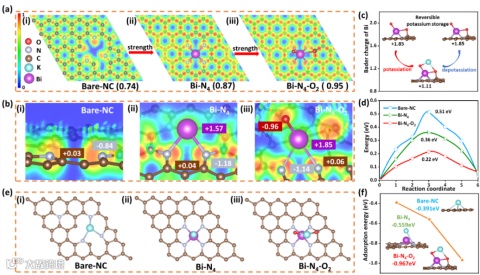 首先,从密度泛函理论的角度考虑了三种可能的配位结构,即裸氮掺杂碳结构(Bare-NC)、氮配位铋金属原子掺杂结构(Bi-N4)和(Bi-N4-O2)。为了阐明三种不同配位结构与它们的钾储存能力之间的关系,利用电子定位函数(ELF)和Bader电荷分析。图1a给出了三个配位结构(Bare-NC、Bi-N4和Bi-N4-O2)的ELF值,分别为0.74、0.87和0.95。ELF值的增加表明这些结构中的电子局域化逐渐增强。Bi-N4-O2结构周围明显的电子定位有利于增加对K+的吸引力,从而提高K+的存储容量。图1b (i-ii)表明,将Bi原子加入NC基体会导致明显的电荷再分配,N原子的电荷从-0.84转移到-1.18、Bi原子的电荷从+1.57转移,这表明Bi原子对NC的电子结构产生了实质性的影响。值得注意的是,当两个O原子和一个Bi原子配位时,不仅在O配位上发生了强烈的电子局域化,而且在Bi-N4-O2上发生了多次电荷转移(图1b (iii))。
