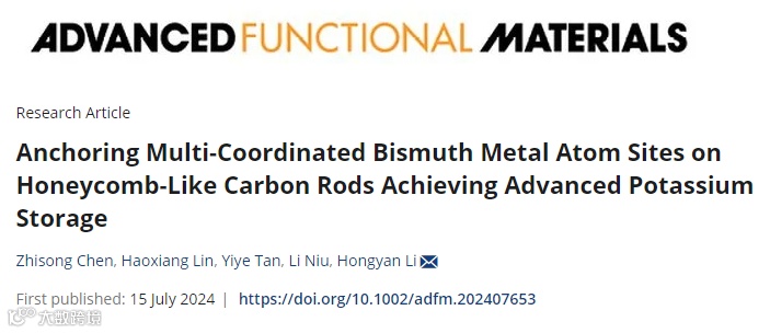 近日,李宏岩老师课题组在国际著名期刊Advanced Functional Materials (IF=18.5)上发表了题为“Anchoring Multi-Coordinated Bismuth Metal Atom Sites on Honeycomb-like Carbon Rods Achieving Advanced Potassium Storage”的研究成果,揭示了铋金属原子与氮、氧非金属原子双配位掺杂碳载体结构对于实现钾离子半/全电池的高容量和长循环寿命的具有重要作用。