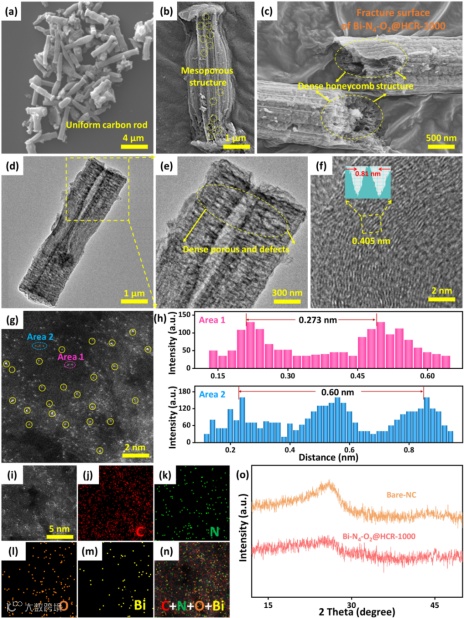 从FESEM中清楚地观察到Bi-N4-O2@HCR-1000呈细长杆状,内部是致密的蜂窝结构(图3a-c)。TEM图也证实了碳棒内部存在广泛的缺陷和孔洞(图3d-e)。图3f得出,碳的晶面间距为0.405 nm,大大超过了石墨的晶格间距特征。晶格间距的增加归因于多配位原子的掺杂。图3g为HAADF-STEM图像,它揭示了Bi金属原子在碳基体中的分布,这些Bi原子呈现为明显的亮点,具有较大的原子半径。进一步证实了Bi原子成功整合到碳载体中。XRD测试中(图3o),以碳(002)晶面为代表的衍射峰在约25°处出现,进一步表明成功合成了Bi-N4-O2@HCR-1000。与Bare-NC相比,Bi-N4-O2@HCR-1000的碳衍射峰更宽,峰强度更低,说明Bi-N4-O2@HCR-1000的缺陷更多,无序性更强。与HRTEM的测试结果一致。