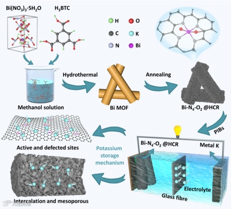 图2. Bi-N4-O2@HCR的制备与储能示意图。