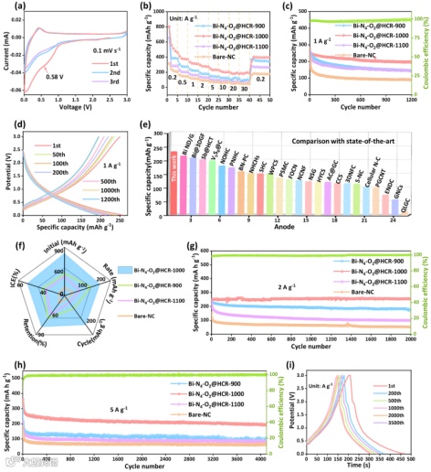 图5显示了Bi-N4-O2@HCR-1000电极的钾储存性能。Bi-N4-O2@HCR-1000表现出了快速的充放电能力、高比容量以及优异的循环稳定性。在电流密度分别为0.2、2、5、20和30 A g-1时,保持563.7、297.9、250.6、191.3和190.7 mA h g-1的放电容量。在5 A g-1电流密度下,Bi-N4-O2@HCR-1000比大多数报道的钾电碳基负极具有更好的倍率可逆容量。在5 A g-1的高电流密度下循环4200次,容量保持在192.2 mA h g-1,每圈只有0.01%的容量衰减。增强的钾储存性能可归因于独特的内部蜂窝状结构,介孔框架以及在N-O配位内掺杂Bi金属原子所产生的协同效应。