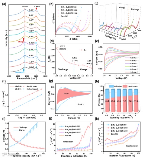 此外,随着合成温度的升高,Bi负载较大的碳棒负极的Rct也会增大。这种现象可能是由于碳棒内部结构在高温下的致密化以及铋原子的积累导致的。如图6d所示,整体Rct值呈现逐渐下降的趋势。放电过程中,Rct值从开路电压显著下降至0.8 V,表明Bi-N4-O2@HCR-1000负极离子输运快,电导率高。随着放电的进行,Rct值略有下降,放电后达到1138 Ω(0.01 V)。随后,电极开始充电,Rct值在0.3~1.0 V时略有增大,这可能是由于SEI膜的产生。最后,在充电完成(3.0 V)时,Rct值达到最小值(678 Ω)。阻抗的减小进一步表明Bi-N4-O2@HCR-1000负极和Bi金属原子位的蜂窝状结构有利于电解质的充分渗透,从而表现出更好的电化学特性。图6f表明Bi-N4-O2@HCR-1000负极的钾储存容量主要由电容控制机制贡献。恒电流滴定测试(图6i)和钾离子的扩散系数DK+(图6j、k)表明了Bi-N4-O2@HCR-1000负极的电位下降最慢,DK+值最大并证明了适当的铋金属原子掺杂负载更有利于电化学性能和储钾的动力学行为。