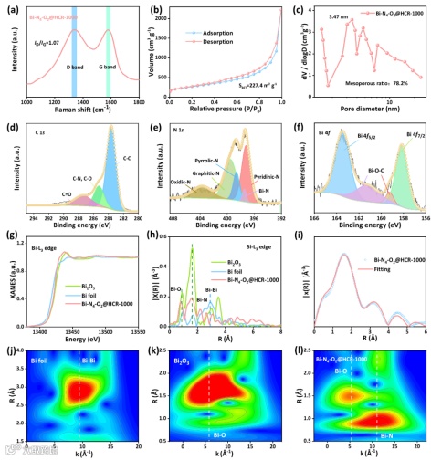 图4.(a)拉曼光谱。(b)N2吸附/解吸等温线。(c)孔径分布曲线。(d-f)XPS光谱。(g)Bi-L3近边XANES光谱。(h)FT-EXAFS光谱。(i)EXAFS拟合曲线。(j-l)Bi-L3近边WT-EXAFS。