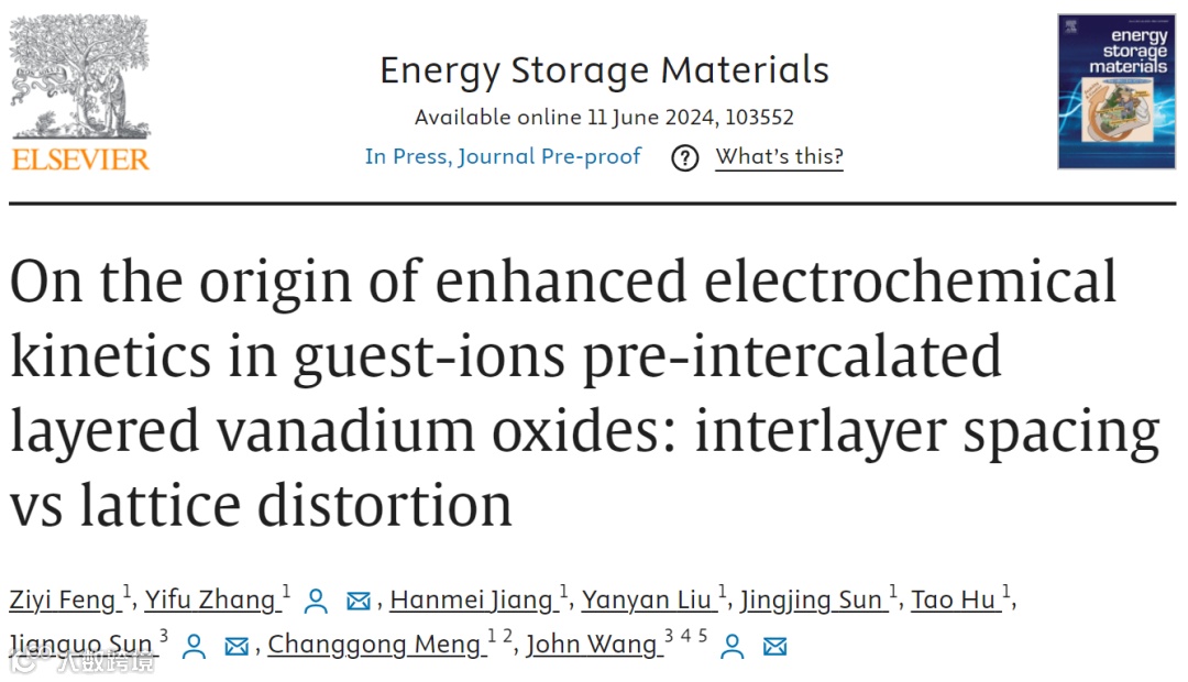 Ziyi Feng, Yifu Zhang*, Hanmei Jiang, Yanyan Liu, Jingjing Sun*, Tao Hu, Jianguo Sun, Changgong Meng, John Wang*, On the origin of enhanced electrochemical kinetics in guest-ions pre-intercalated layered vanadium oxides: interlayer spacing vs lattice distortion, Energy Storage Materials, 2024,103552.