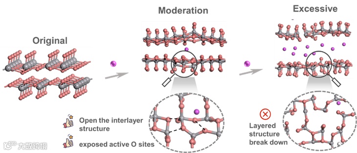 金属离子预插入VOH将导致V-O键的断裂,暴露活性O位点,从而提高存储更多Zn2+位点的能力。并且由于局部晶格失真,电荷重新分布,不均匀的电荷分布可以促进Zn2+的反应动力学,并增强VOH的电化学性能;然而过量的预插层金属离子将导致骨架结构的崩溃,从根本上降低Zn2+存储能力。