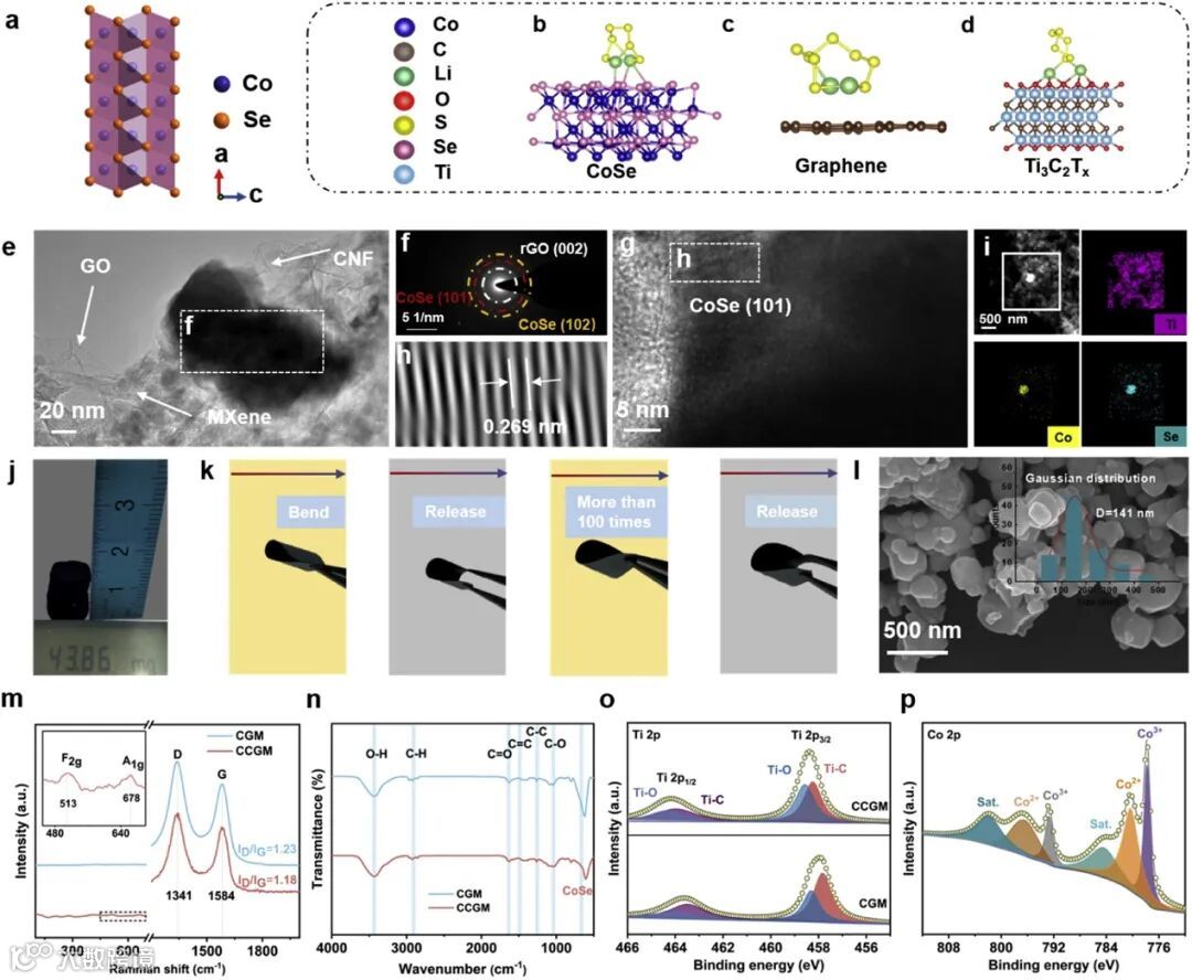 CoSe晶体结构表明,它属于 NiAs 的六方 B81 结构。研究人员已经证明 NiAs 型材料可以有效催化多硫化物转化。其中,Se 阴离子以六方密堆积 (hcp) 模式排列,形成沿 c 轴共享共同面的八面体。同时,Co 阳离子占据八面体的中心位置,Se 阴离子占据由 Co 阳离子创建的三棱柱的中心位置。该报道中SHS CCGM 气凝胶重量极轻,直径 13 mm、高 16 mm 的气凝胶重量仅为 43.86 mg。此外,柔性电极在可穿戴智能设备中发挥着重要作用。图 2k 显示了柔性自支撑 SHS CCGM 的弯曲试验。可以看出,CCGM 自支撑膜即使在 100 次弯曲试验后仍表现出良好的柔韧性。
