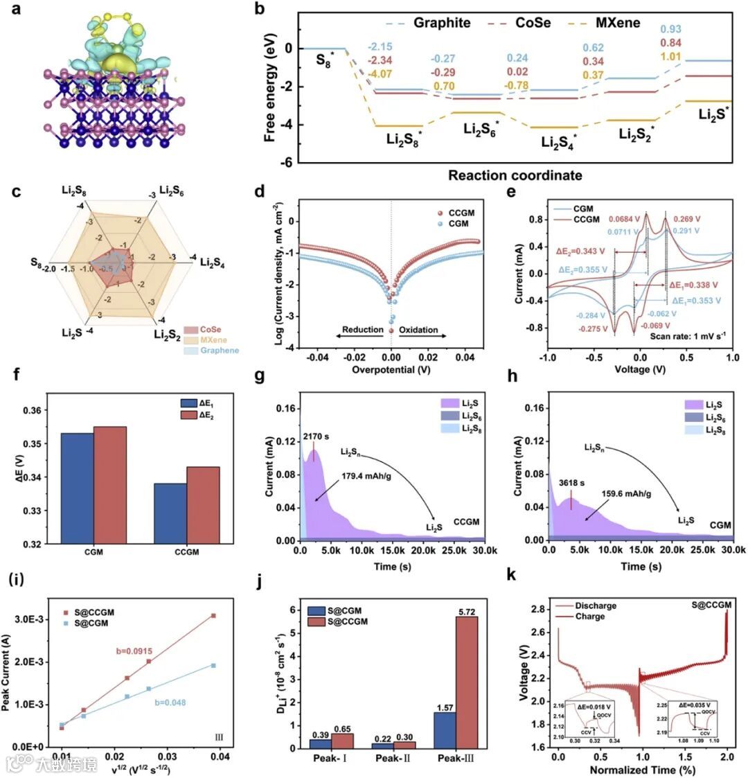 DFT计算结果表明:与石墨烯 (0.93 eV) 和 Ti3C2Tx (1.01 eV) 相比,CoSe 的显示出较低的吉布斯自由能 (0.84 eV),这表明在 CoSe 表面生成 Li2S在热力学上是可行的,CoSe 的存在会诱导快速的电子/离子转移以及 LiPS 和硫的快速相互转化。另外,CoSe展现出比 MXene 和石墨烯更适中的吸附能。有研究表明,对于低于0.8 eV 的结合能,LiPS 仅被弱固定,并且很可能从硫正极扩散出去。相反,对于高于2.0 eV 的结合能,LiPS 结合太强,可能毒害电催化剂的活性位点;最佳结合能可能在约 -0.8 至 -2.0 eV 范围内 。DFT计算显示CoSe处于理想吸附能区间,有助于充分发挥催化活性。此外,MXene的高吸附能表明其与多硫化物有较强的化学吸附作用,可以有效地锚定多硫化物。结合以上理论计算,CoSe、Ti3C2Tx和石墨烯的协同作用促进了LiPSs的化学吸附和催化作用,保证了CCGM的优异性能。另外,通过对称CV、Tafel测试以及Li2S成核、溶解等电化学测试进一步研究了CCGM的催化性能。