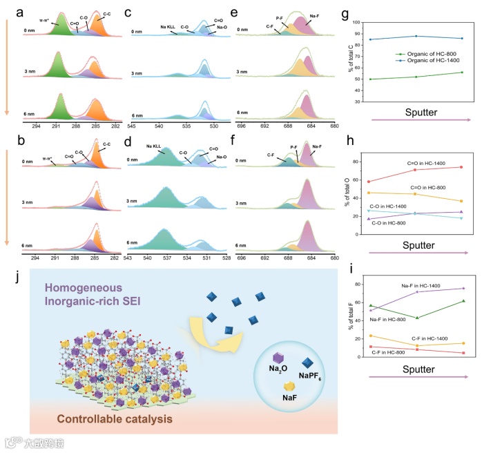 从界面入手,探究了SEI与储钠行为之间的关系,通过不同蚀刻深度的XPS研究了循环后的HC负极上SEI的结构和组成。推断羰基能够诱导界面催化产生高度稳定的富氟固体电解质界面层,有助于HC-1400负极实现稳定和优异的循环性能。