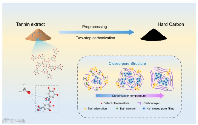 图1. 单宁提取物衍生硬碳材料的制备过程及闭孔结构变化示意图