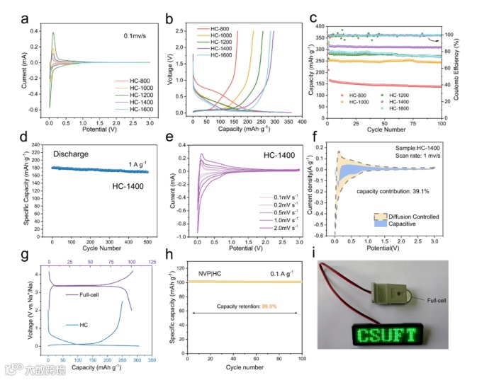 制备的硬碳材料组装成半电池以研究其储钠性能,发现HC-1400表现出最优异的电化学性能,在30 mA g−1下表现出高可逆容量和ICE (360.96 mAh g-1, 82%),良好的倍率性能和循环稳定性 (1A g-1下循环500次后放电容量达169.2mAh g-1)。为了证实该材料的实际应用潜力,全电池由NVP正极和HC-1400负极组装。在电流密度为0.1 A g-1下的首次充放电容量高达102.1 mAh g-1,并在0.1 A g-1下进一步检查了NVP|HC全电池的循环稳定性和使用寿命,NVP|HC全电池在使用超过100次循环后容量保持率为99.5%,表现出优异的耐用性和稳定性。