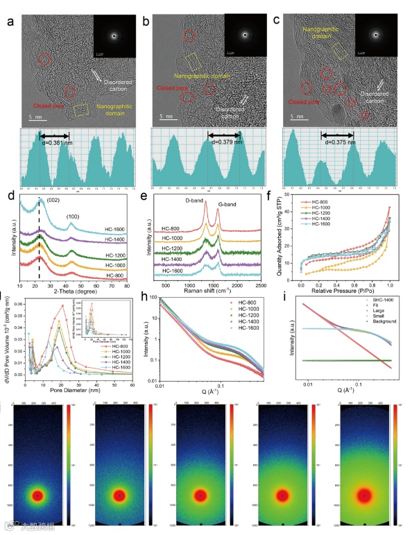 综合来看,推测随着碳化温度的提升,闭孔数量增多且层间距减小,在HC-1400前的高温裂解过程中,大量开孔微孔受到显著影响。随着层间距缩小,纳米碳层发生弯曲乃至坍塌,导致密集的开孔减少并转化为较小的闭孔。温度的进一步升高促使许多相邻的闭孔纳米碳层融合,闭孔直径会进一步增大,然而闭孔面积会减小(1600 °C)。