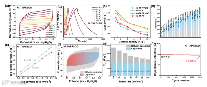 Figure 4. Electrochemical performance of Ni-TAPP and Ni-TAPP/rGO the in 6 M KOH electrolyte: (a) CV curves at various scan rates from 5~100 mV·s−1, (b) The GCD profiles at different current densities from 0.5~10 A·g-1, (c) Comparison of specific capacitance at current densities of 0.5~100 A·g−1. (d) Comparison of specific capacitance performance with Ni-TAPP/rGO, Ni-TAP/rGO and other materials. (e) The fitting plot between log (i) and log(v), f) CV curves with the diffusion contribution at 20 mV·s−1, (g) normalized diffusion contribution at various scan rates. (h) Ni-TAPP/rGO’s 10,000 times supercapacitor stability test at 10 A·g-1.