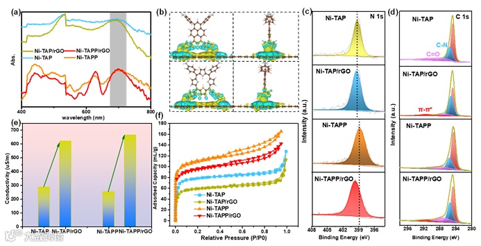 Fig. 3 (a) UV-vis DRSspectra; (b) simulated differential charge density of Ni-TAP/rGO, and Ni-TAPP/rGO; XPS spectra of (c) N 1s; (d) C 1s; (e) the conductivity test of Ni-TAP. Ni-TAP/rGO and Ni-TAPP, Ni-TAPP/rGO; (f) N2 adsorption–desorption isotherms.