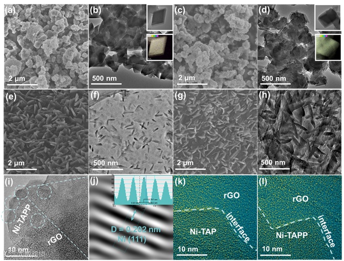 Fig. 2. (a) SEM image of Ni-TAP; (b) TEM images of Ni-TAP, and corresponding TEM and elemental mapping of single COFs; (c) SEM image of Ni-TAPP; (d) TEM image of Ni-TAPP, and corresponding TEM and elemental mapping of single COFs; (e) SEM image of Ni-TAP/rGO; (f) TEM image of Ni-TAP/rGO; (g) SEM image of Ni-TAPP/rGO; (h) TEM image of Ni-TAPP/rGO; (i and j) HRTEM image of Ni-TAPP/rGO, and the corresponding inverse FFT patterns of HRTEM; (k and l) STEM images of Ni-TAP/rGO and Ni-TAPP/rGO.
