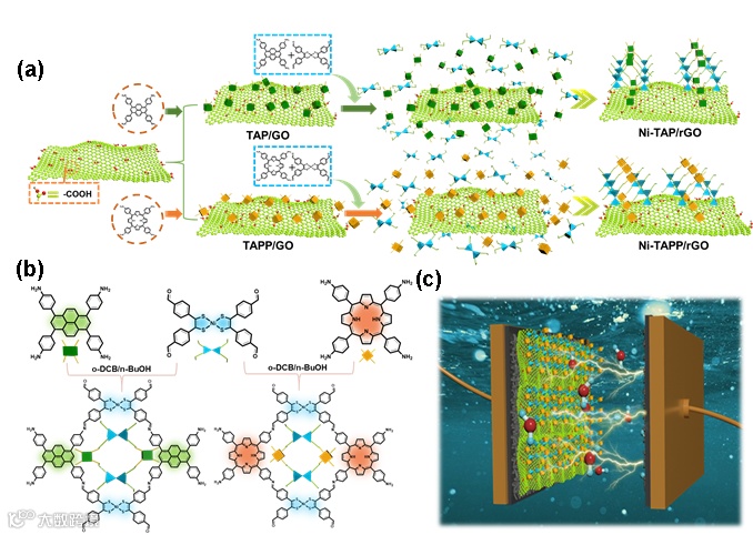 基于此,来自南京大学的左景林教授与丁梦宁教授合作,在Journal of Materials Chemistry A上发表题为“Donor–π–acceptor heterojunctions constructed from the rGO network and redox-active covalent organic frameworks for high-performance supercapacitors”的文章。此文章利用自组装合成法在氧化石墨烯(GO)表面原位生长二维堆积的镍二硫烯基共价有机骨架(Ni-TAP和Ni-TAPP)薄层,制备了Ni-TAP/rGO和Ni-TAPP/rGO复合材料。