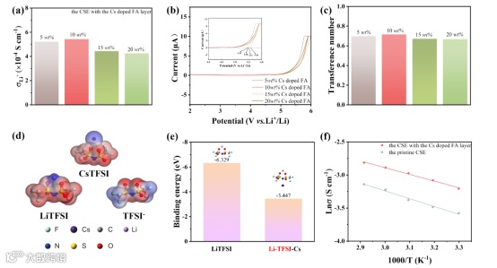 通过研究含有不同Cs掺杂FA的复合电解质,发现10wt% Cs掺杂FA可以使电解质表现出最高的电导率(5.43×10-4 S cm-1)和高的锂离子迁移数(0.716)。密度泛函理论(DFT)计算证实了Cs+离子与LiTFSI之间的配位关系,从而降低了LiTFSI与Cs+的结合能,增加了游离Li+的数量。Arrhenius曲线表明Cs掺杂FA界面层的引入有效降低了电解质的活化能。