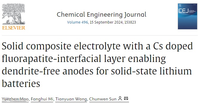 近日,来自中国矿业大学(北京)的孙春文教授,在国际知名期刊Chemical Engineering Journal上发表题为“Solid composite electrolyte with a Cs doped fluorapatite-interfacial layer enabling dendrite-free anodes for solid-state lithium batteries”的研究性文章。该文章提出为了调节固态锂电池中锂金属负极和复合电解质的界面,通过引入Cs掺杂氟磷灰石(FA)界面层来抑制锂枝晶的生长。一方面,Cs本身具有的静电屏蔽自愈合特性可以降低锂离子的成核电位,并促进锂离子的均匀沉积;另一方面,Cs还可以降低LiTFSI的结合能,促进游离的锂离子增加。因此,Cs掺杂FA界面层有利于形成均匀致密的固体电解质界面(SEI),促进Li+的均匀沉积,从而使得金属锂表面更加稳定,从而延长了LMBs的电池寿命。