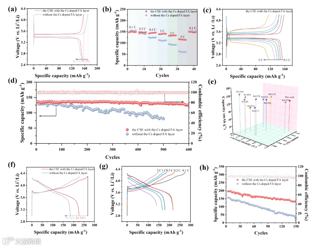 通过与不同的阴极材料(LFP/NCM811)匹配,进一步评估了含有Cs掺杂FA界面层的复合电解质的电化学性能,研究多组分的SEI层对界面稳定性的影响。与原始的CSE相比,使用含有Cs掺杂FA界面层的复合电解质组装的全电池具有更稳定的长循环性能,倍率性能更高。
